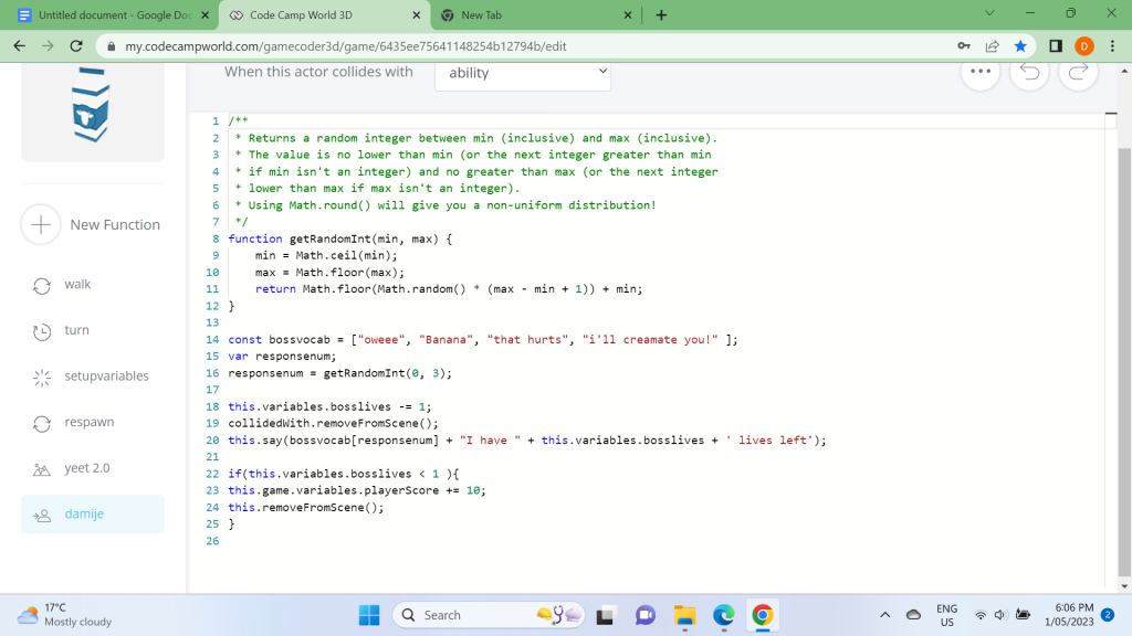 I went to a holiday program called codecamp and I made a game using java script which is a programming language. The game was 3d and had two levels before the main fight. This part is really hard for beginners as the enemy has ten lives and you only have 3, you fire arrows at a milk carton and the carton fires rubber duckies at you, fast. The coding was mostly quite simple (for me) as I do computer programming a lot. This was quite an interesting task for me as I don’t often do games, let alone 3d ones. After the